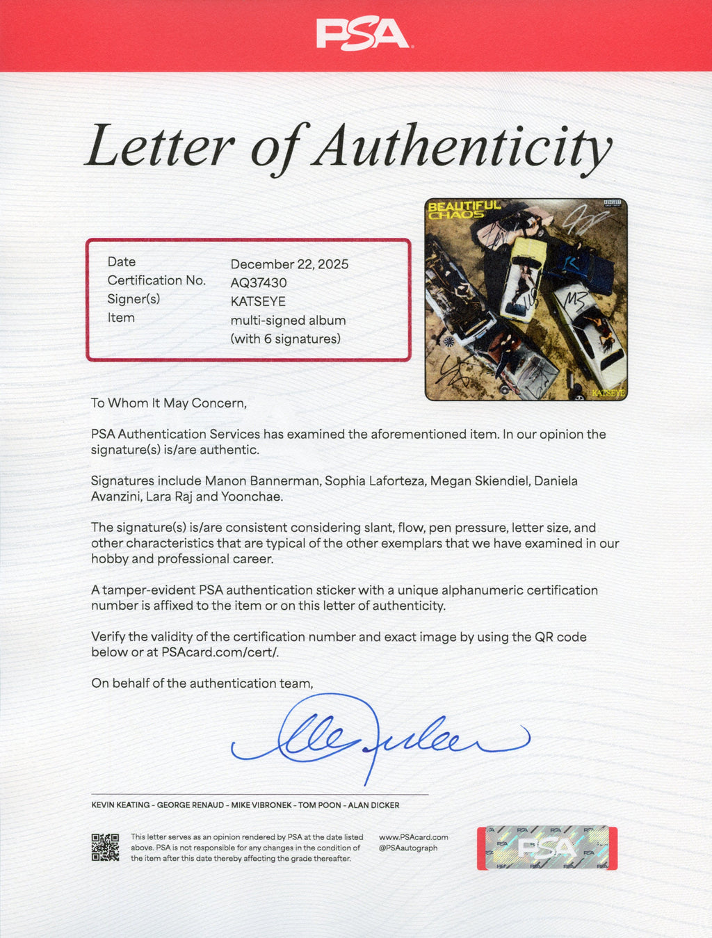 This item is signed by Manon Bannerman, Sophia Laforteza, Megan Skiendiel, Daniela Avanzini, Lara Raj, and Yoonchae of the the global pop girl group KATSEYE.